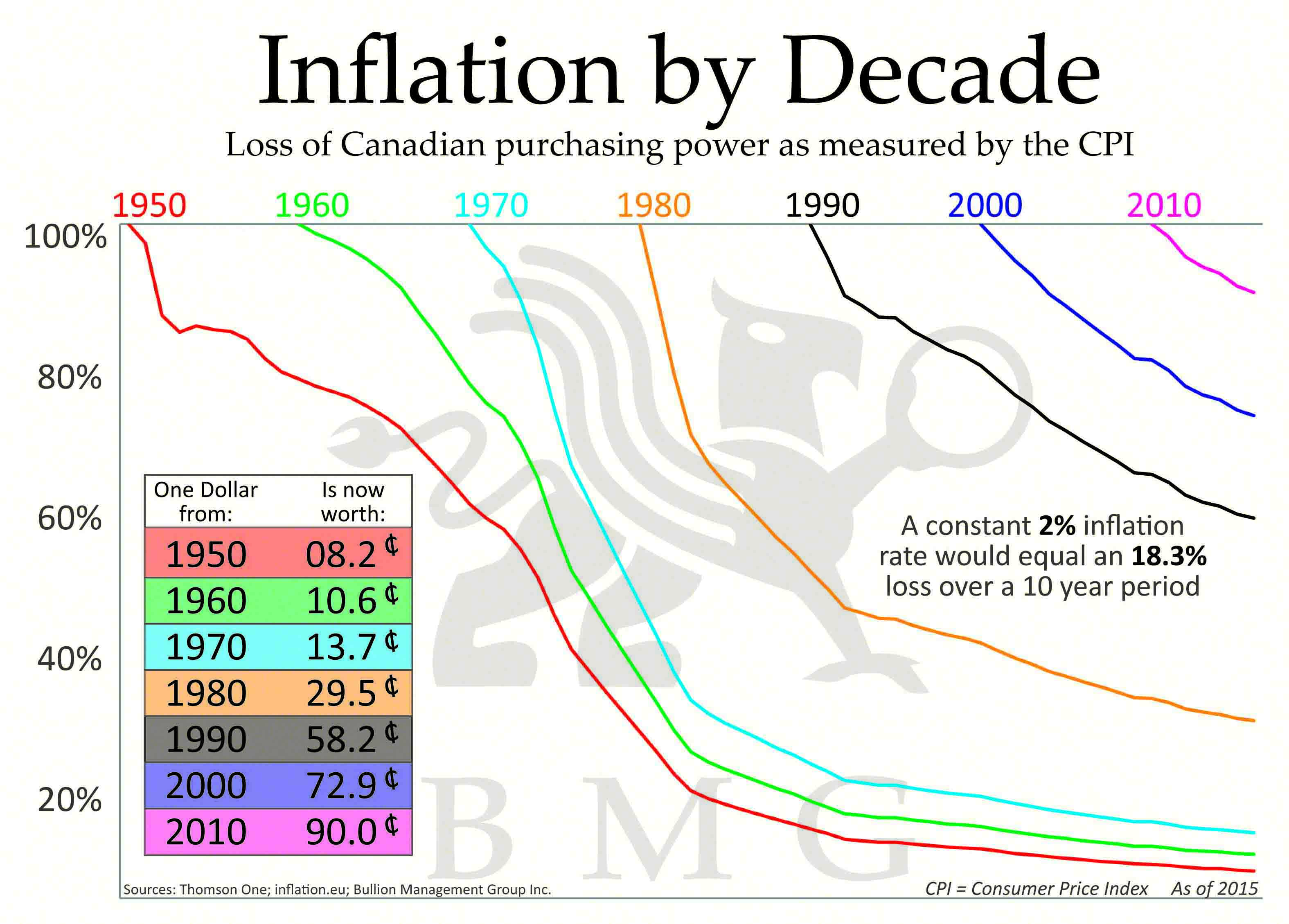 One thing is for sure. If you simply stuff cash under your mattress, and come back half a century later, you likely won’t be happy with what you can buy using those green dyed pieces of paper. As shown in the graph below, the purchasing power of the U.S. dollar has decreased every decade since the 1950’s, even with the very low observed inflation rates of recent decades. [REF]